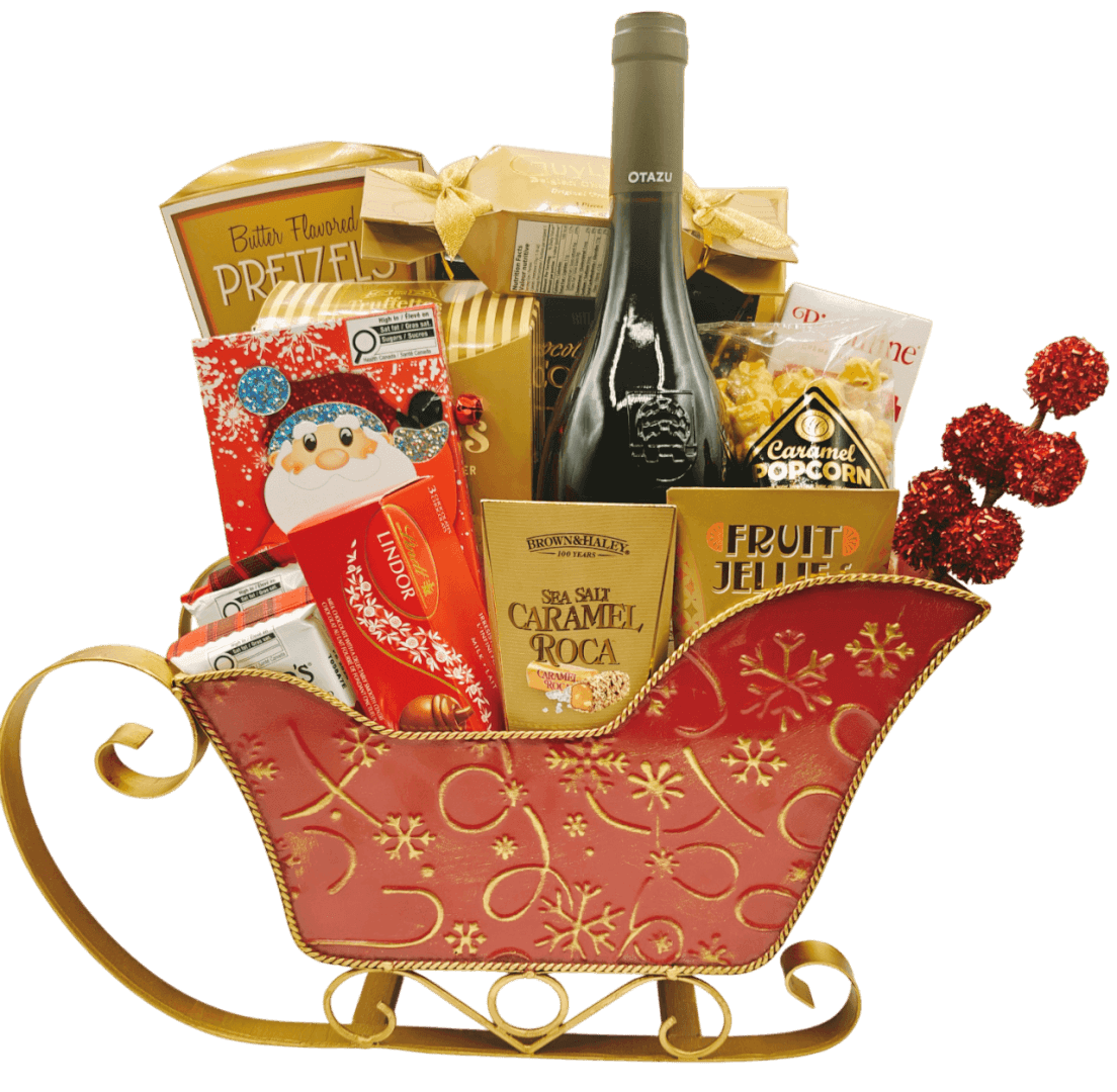 Magnifique traîneau festif débordant d’un assortiment délicieux de douceurs chocolatées : Truffes fondantes, gaufrettes croustillantes, bretzels beurrés, friandises festives, Vin et bien plus à découvrir !